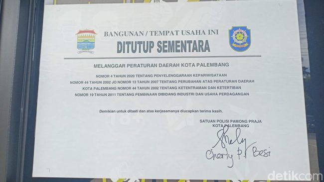 Selain itu, di bagian pintu utama terlihat selembar kertas berisi penyegelan. Surat penyegelan itu ditandatangani Satpol PP Palembang.