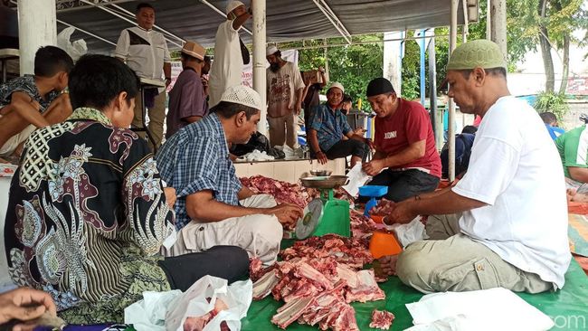 Di sisi lain, warga penerima jatah kurban juga sudah ramai berkumpul di sekitaran masjid untuk dapat mengambil daging kurban.