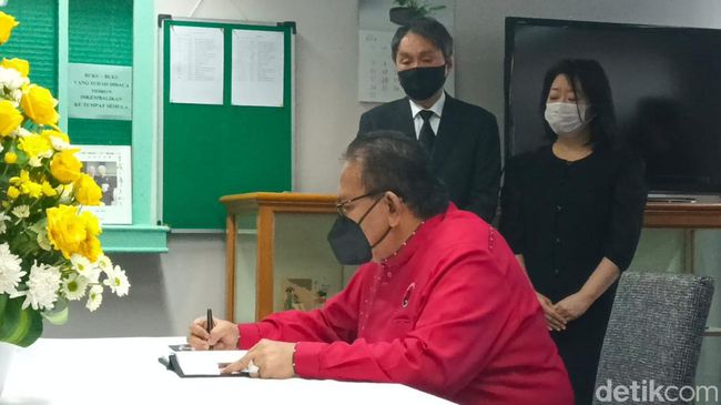 Pantauan detikSumut, Senin (11/7/2022), Baskami datang sekitar pukul 11.13 WIB dengan mengenakan kemeja merah berlogo PDIP. Dia kemudian menulis ucapan duka cita di buku hitam yang sudah disiapkan Konjen Jepang. Ia juga mengucapkan salam kepada Konsulat Jendral Jepang yang ada di lokasi.