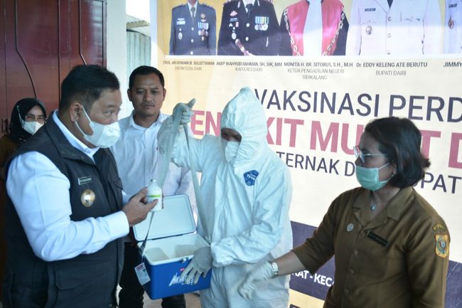 Pemerintah Kabupaten Dairi melalui Dinas Pertanian, Ketahanan Pangan, dan Perikanan mengadakan vaksinasi perdana penyakit mulut dan kuku (PMK) pada ternak di Kelurahan Sidiangkat, Kecamatan Sidikalang, Senin (18/7) lalu. Hal ini dilakukan guna mengantisipasi terjangkitnya virus penyakit kuku dan mulut kepada hewan ternak.