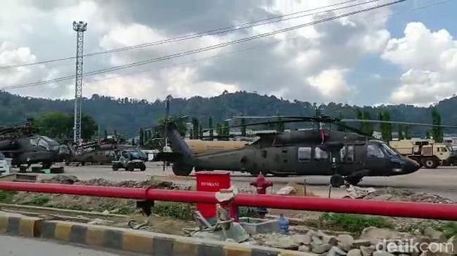 Kendaraan tempur AS mulai dari Hummer Humvee, tank hingga Helikopter Black Hawk itu berjejer di pelabuhan. Senjata militer berbagai ukuran juga terlihat di sana.