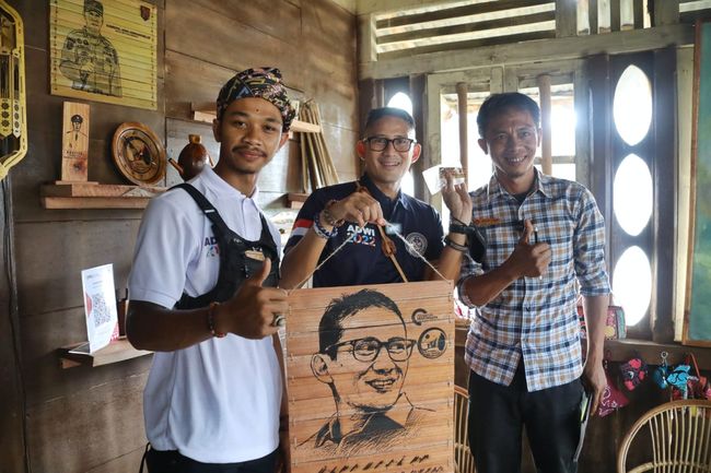 Menparekraf Sandiaga Uno mendatangi Desa Wisata Belitar Seberang, Bengkulu. Pada kunjungannya itu, Sandiaga bertemu dengan Wimmy (40) yang aktif berkarya menggunakan media alat laser di Roemah Ekraf Belirang.