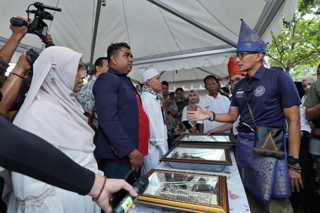 Menparekraf Sandiaga Uno mendatangi Gampong Ulee Lheue, Meuraxa, Kota Banda Aceh. Dalam kesempatan itu, Sandiaga memberikan alat bantuan ke pengrajin kriya lobster bingkai bernama Irsan Syahputra berumur 41 tahun.