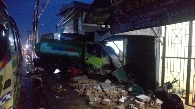 Truk tangki air tabrak dua rumah warga dan satu unit bus penumpang di Jalan Jamin Ginting Km 8, Kwala Bekala, Medan. Truk tangki itu tergelincir saat menginjak rem.