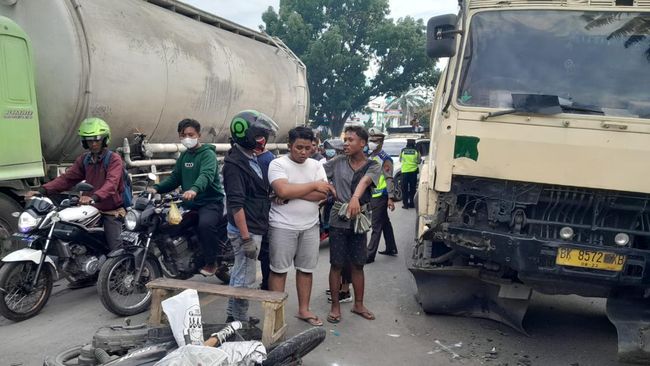 Sepeda motor yang ditumpangi tiga orang mengalami kecelakaan di Jalan Kapten Sumarsono, Kecamatan Labuhan Deli, Deli Serdang. Satu penumpang tewas di tempat setelah berbenturan dengan truk.