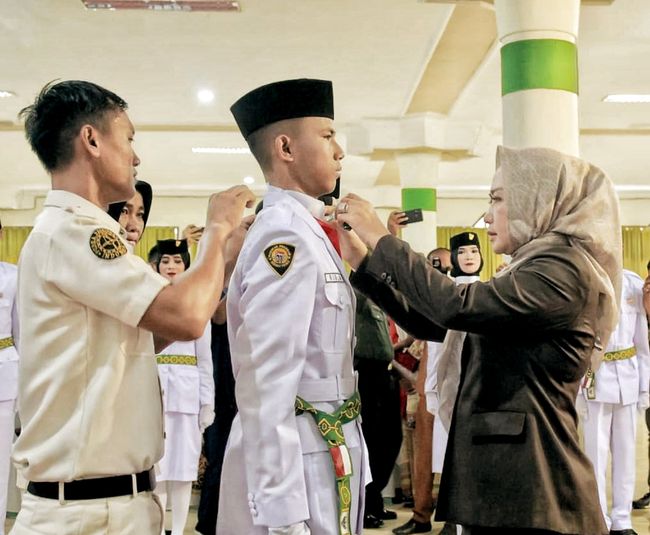Bupati Tulang Bawang Winarti mengukuhkan anggota Pasukan Pengibar Bendera (Paskibra) Kabupaten Tulang Bawang. Acara pengukuhan berlangsung di Aula Masjid Islamic Center Menggala, Senin (15/8).
