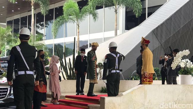 Pantauan detikcom, Jokowi dan Iriana tiba di gedung DPR/MPR sekitar pukul 08.55 WIB, Selasa (16/8/2022). Jokowi dikawal oleh anggota Paspampres.