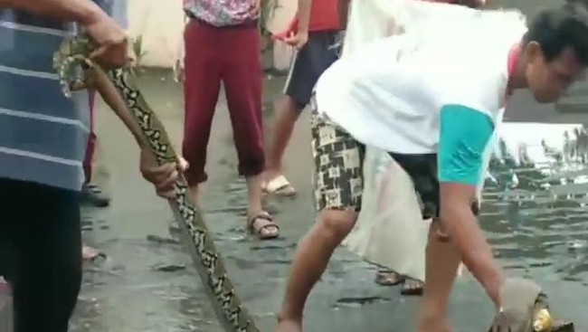 Dalam video lainnya, ular itu terlihat sudah berada di luar rumah dan dipegang oleh dua pria. Sejumlah orang yang berada di lokasi terlihat menjadikan penangkapan ular itu sebagai tontonan.