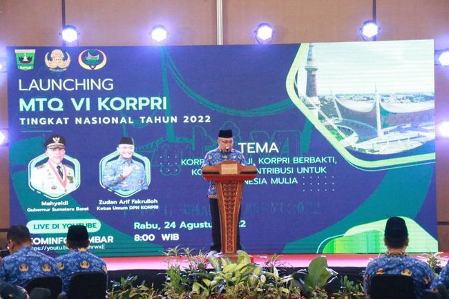 Gubernur Sumatera Barat Mahyeldi bersama Ketua Umum DPN Korpri Zudan Arif Fakrulloh secara resmi meluncurkan Musabaqah Tilawatil Quran (MTQ) ke-VI Korps Pegawai Republik Indonesia (Korpri) Tingkat Nasional Tahun 2022, Rabu (24/8). Tahun ini, Sumatera Barat menjadi tuan rumah gelaran MTQ Korpri.