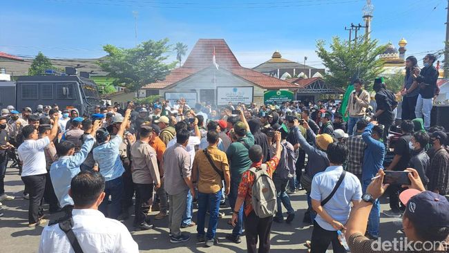 Pantauan detikSumut di lokasi, Rabu (31/8/2022) petang, awalnya para mahasiswa berunjuk rasa di depan gedung DPRD. Mereka kemudian berusaha masuk ke pelataran gedung dewan, namun tak diizinkan.