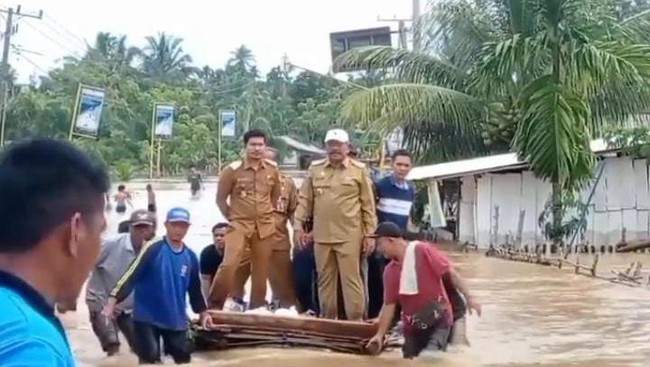 Dilihat detikSumut, Jumat (2/9/2022), Bupati dan Wakil Bupati Bengkulu Utara meninjau lokasi banjir di Kecamatan Batik Nau. Keduanya memakai pakaian dinas, selain bupati dan wakil bupati ada beberapa orang lain yang ikut menaiki rakit yang sama.
