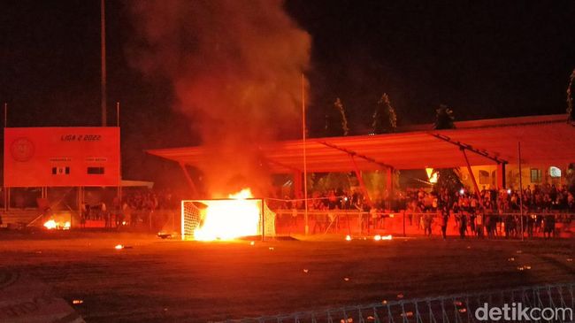 Papan sporsor itu dikumpulkan di beberapa titik lalu dibakar. Penonton juga membakar jaring gawang dengan papan sponsor yang terbakar.