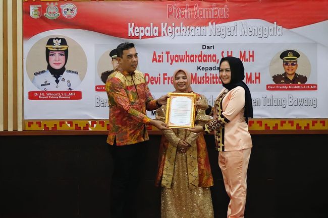 Bupati Tulang Bawang Winarti menggelar acara pisah sambut Kepala Kejaksaan Negeri (Kajari) Menggala di Rumah Dinas Bupati, Selasa (6/9). Dalam kesempatan ini, Azi Tyawhardana resmi menyerahkan jabatannya sebagai Kajari Menggala secara estafet kepada Devi Freddy Muskitta.