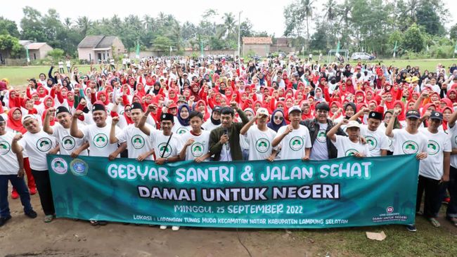 Sebanyak 1.000 santri dan masyarakat Kabupaten Lampung Selatan meramaikan kegiatan 'Gebyar Santri dan Jalan Sehat, Damai untuk Negeri'. Dalam acara yang diselenggarakan oleh Santri Dukung Ganjar (SDG) ini, mereka juga mengonsolidasikan dukungan untuk Ganjar Pranowo jadi Presiden 2024.