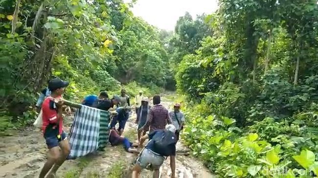 Video yang merekam kejadian itu bahkan viral di media sosial. Saking rusaknya jalan di sana, seorang warga yang ikut menandu wanita itu sempat terjatuh.