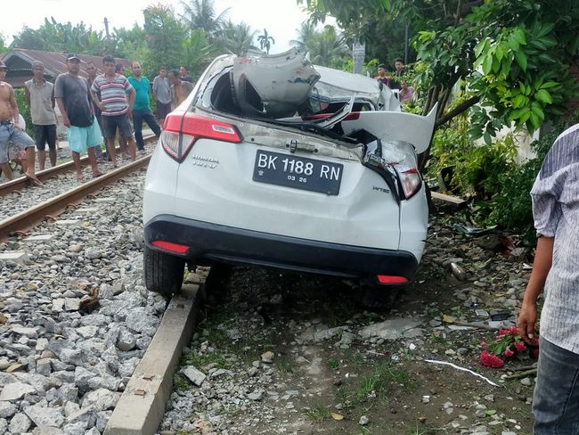 "Dan kereta api sudah berjarak 15 meter langsung menabrak mobil, mobil terhempas dan terguling 10 meter, korban jiwa tidak ada, korban luka dua orang langsung dilarikan ke rumah sakit Latersia, Binjai," sambungnya.