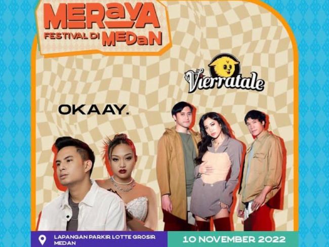 Grup musik Vierratale dan OKAAY akan konser di Kota Medan. Konser yang digagas Meraya Festival akan digelar pada 10 November 2022 di Lapangan Parkir Lotte Grosir Medan.