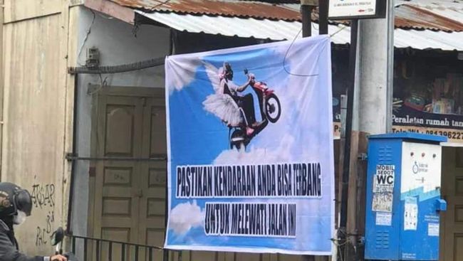 Dari foto yang dilihat detikSumut, Kamis (27/10/2022), spanduk tersebut dipasang warga tepat di persimpangan jalan. Di dalam spanduk juga terdapat sepeda motor yang dikasih sayap.