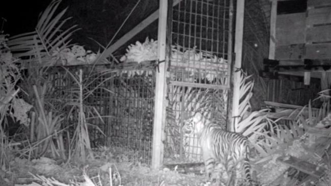 Terlihat harimau mondar mandir dekat mulut perangkap yang dipasang. Tidak lama kemudian harimau masuk dan pintu perangkat tertutup setelah umpan yang dipasang dimangsa.
