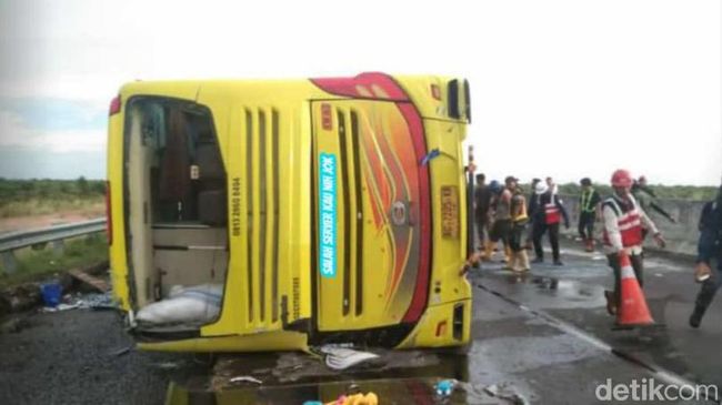 Bus yang membawa rombongan Paskibraka dari Muara Belida, Muara Enim, Sumatera Selatan (Sumsel) terbalik di ruas Tol Palembang-Lampung. Akibatnya, 14 penumpang mengalami sejumlah luka dan harus menjalani perawatan.