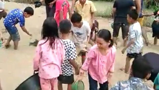 Dalam rekaman video yang beredar di media sosial itu, puluhan bocil tersebut ada yang menenteng jaring, baskom hingga ember. Mereka sibuk mengamati setiap pergerakan ikan lele yang dilepas warga di tengah kubangan.