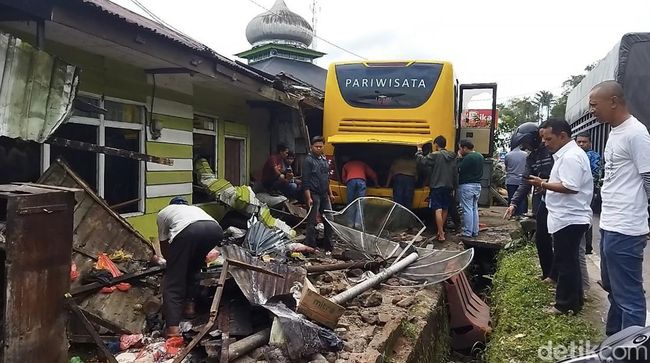 Sebelum menabrak 3 rumah warga, bus juga menyapu 3 sepeda motor yang terparkir dan menabrak 3 pejalan kaki atas nama Asrul, Firman Ilahi dan Gusril. Sementara, para penumpang bus selamat dari maut. Hanya Iqbal, sopir bus yang ikut mengalami luka ringan.