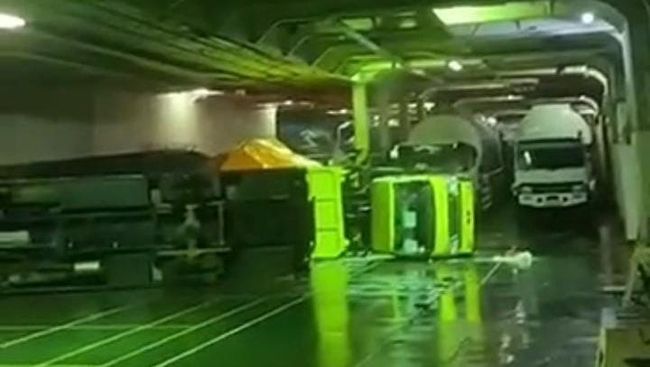 Dalam video itu juga terlihat kendaraan yang di dalam kapal terbalik. Dijelaskan jika suasana di dalam kapal itu terjadi karena kapal yang sedang terombang-ambing di tengah ombak yang besar.