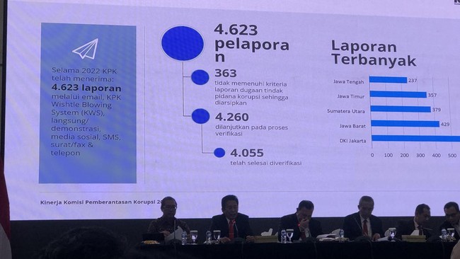"Selama 2022, KPK telah menerima 4.623 laporan dari berbagai daerah," kata Wakil Ketua KPK Johanis Tanak dalam konferensi pers kinerja KPK tahun 2022 di Gedung Juang KPK, dilansir detikNews, Selasa (27/12/2022).