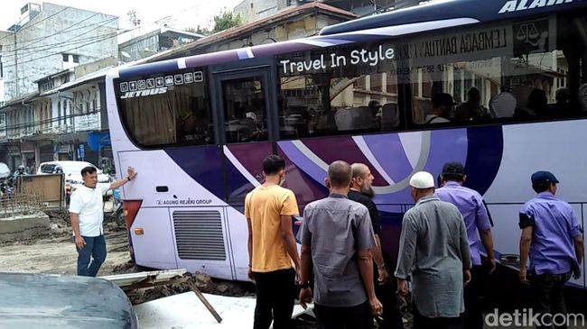 "Karena banyak parkir mobil sebelah kiri, kita ambil ke sebelah kanan jalan. Rupanya ban kanan belakang bus amblas, bekas korek-korekan perbaikan jalan," Kata Imam kepada detikSumut, Rabu (28/12).