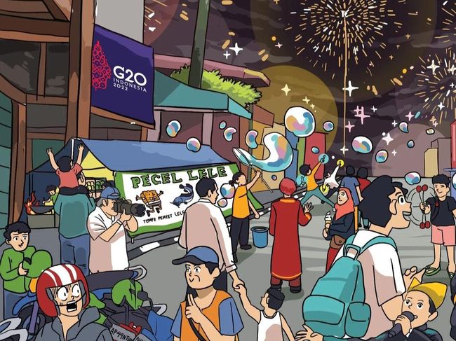 Dalam unggahan Jokowi itu juga terlihat anak kecil sedang bermain lato-lato, mainan yang belakangan mencuri perhatian di Indonesia. Ondel-ondel khas Betawi juga terlihat dalam unggahan itu.