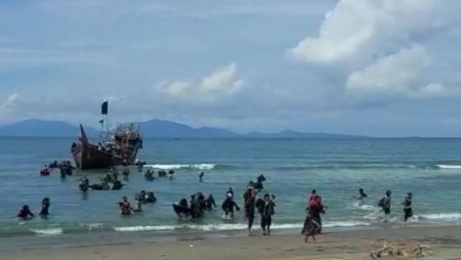 Berdasarkan video diperoleh detikSumut, pengungsi Rohingya itu tampak berlarian turun dari kapal yang berlabuh tak jauh dari bibir pantai. Sebagian 'manusia perahu' itu sudah berada di daratan.