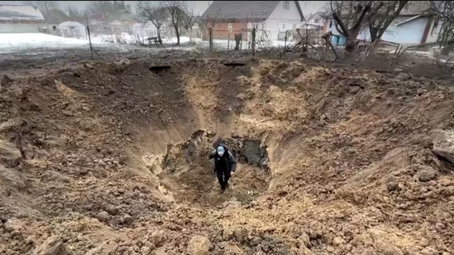 Medan - Roket milik Rusia menghantam daerah pemukiman di Desa Kopyliv di wilayah luar Kyiv, Ukraina, Sabtu (14/1). Akibat serangan roket itu, ada kawah besar yang terjadi di lokasi. Begini penampakan kawah tersebut.