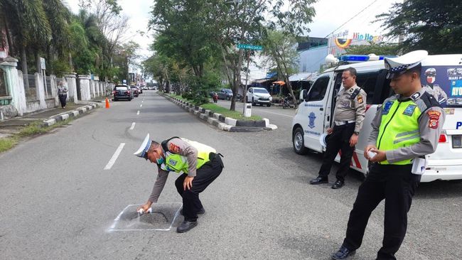Informasi diperoleh detikSumut, polisi menyemprotkan cat di sekeliling jalan berlubang sebagai penanda bagi pengguna jalan. Cat berwarna putih itu terlihat mencolok dari kejauhan.