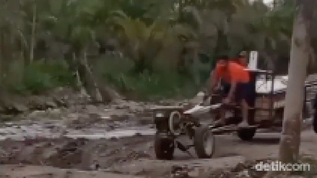 Berdasarkan video viral yang dilihat detikSumut, Jumat (3/2/2023), terlihat sejumlah warga melewati sebuah jalan dengan kondisi rusak parah.