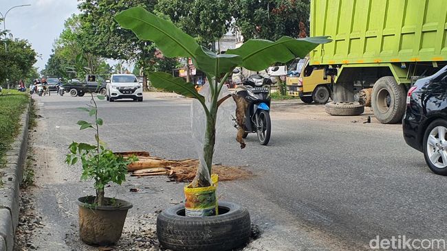 Lubang yang ditanami pisang dan pohon jeruk itu berada tepat di persimpangan gapura Stadion Utama Riau. Selain pohon pisang dan jeruk, ada juga batang pisang diletakkan di jalan agar pengendara lebih hati-hati.