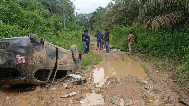 Mobil tersebut bahkan sampai terguling di pinggir jalan berlumpur dengan kaca mobil pecah dan ban belakang sebelah kanan lepas. Polisi kemudian mengamankan mobil tersebut di jalan masuk ke hutan, kawasan Pemayung, Kabupaten Batanghari, Jambi, Kamis (2/3/2023).