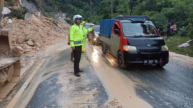 "Longsor tadi menutupi badan jalan dan mengakibatkan jalan putus total. Akses putus total berada di KM 81 akibat tanah, bebatuan dan pohon menutup jalan," kata Donni, Selasa (21/3/2023).
