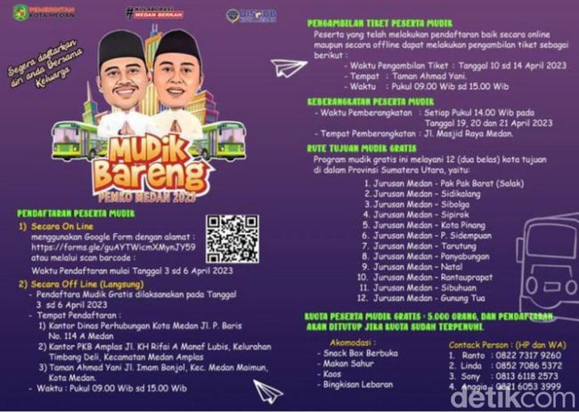 Iswar menyebut pendaftaran mudik gratis ini dibuka mulai 3-6 April 2023. Pemkot Medan membuka dua jenis pendaftaran, yakni melalui online atau offline