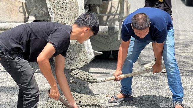 Dari video yang diterima detikSumut, para pemuda terlihat menimbun jalan rusak di Jalan Parit Indah Pekanbaru. Terlihat ada truk molen berisi semen untuk menimbun jalan rusak.