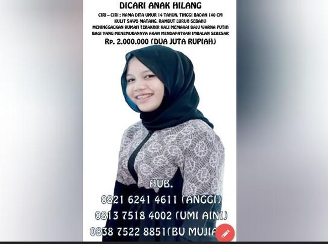 Sebuah pengumuman orang hilang yakni siswi SMP berusia 14 tahun bernama Dita beredar di media sosial. Pihak keluarga memberikan iming-iming hadiah Rp 2 juta kepada siapapun yang bisa menemukan anak tersebut.