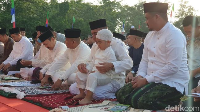 Gubernur Sumatera Utara (Sumut) Edy Rahmayadi melaksanakan salat Idul Fitri 2023 bersama dengan Wali Kota Medan Bobby Afif Nasution di Lapangan Bola Taman Carikan, Kota Medan. Sembari menunggu waktu salat Id, Edy terlihat memangku Al Nahyan, anak Bobby.
