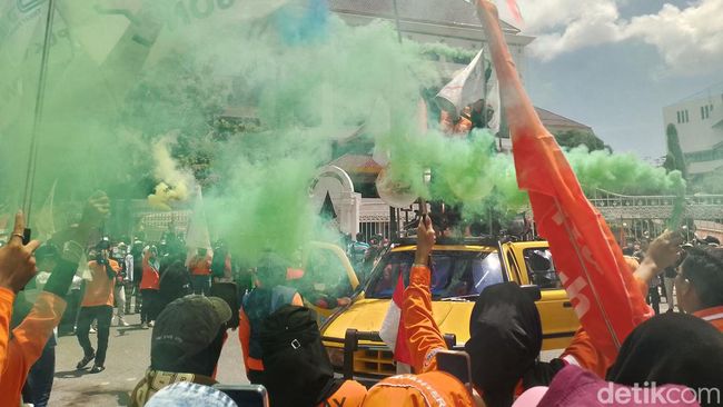 "Kami hari ini turun ke jalan untuk memperingati hari buruh internasional. Kami juga menyampaikan beberapa poin tuntutan buruh di sini," kata orator tersebut, Senin (1/5/2023).