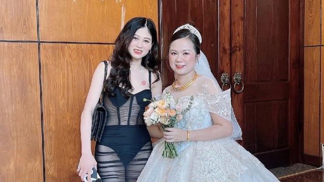 Kemudian, pada foto lain, Anh Thu berpose bersama mempelai wanita. Gayanya saat kondangan ini jadi atensi karena dia terlihat memakai dress tulle berwarna hitam dengan bikini berwarna sama.