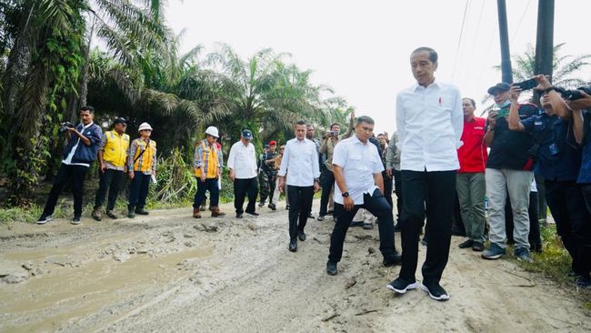 Presiden Joko Widodo (Jokowi) meninjau jalan rusak di Kabupaten Labuhanbatu Utara. Jokowi pun berjanji akan memperbaiki jalan rusak itu paling lama Juli mendatang.