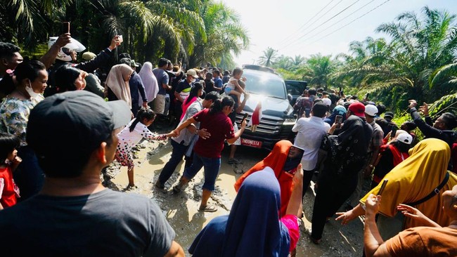 Dari foto yang diterima detikSumut, Rabu (17/5/2023), warga setempat mulai dari emak-emak hingga anak-anak rela menginjak jalan rusak yang berkubang lumpur tersebut demi bisa berfoto dengan mobil presiden.