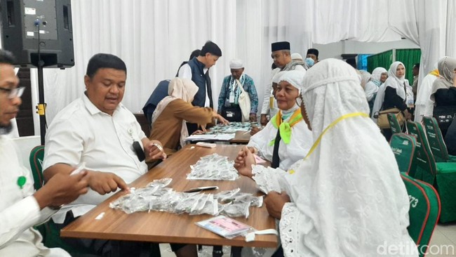 Sebagian jemaah lansia tampak menuju gedung tersebut menggunakan mobil golf. Setiba di sana, mereka diarahkan ke meja pemeriksaan kesehatan serta menjalani prosesi lainnya.