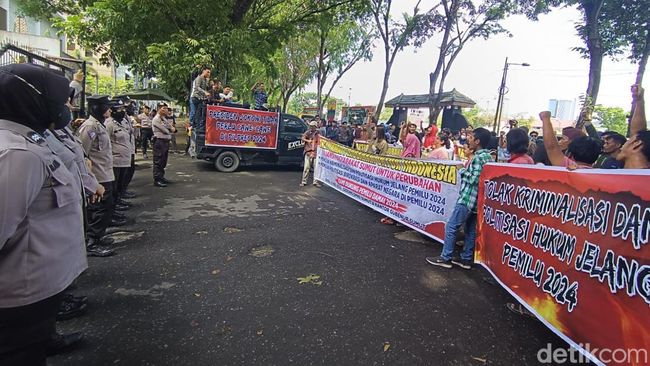 Pantauan detikSumut, Rabu (31/5/2023) sekitar pukul 10.48 WIB sejumlah massa aksi sudah berada di depan Kantor DPRD Sumut. Mereka datang dengan mengendarai angkot dan dituntun oleh satu mobil komando.