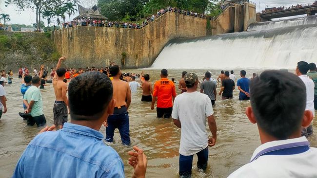 Dari foto yang diterima, terlihat ratusan warga memadati bendungan tersebut. Air bendungan juga terlihat kecilkan untuk memudahkan pencarian.