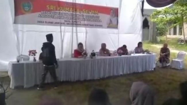 Pada video tersebut tampak puluhan orang berkumpul dan duduk dalam acara reses. Ada pula spanduk bertuliskan nama Sri Kumala dalam video itu.