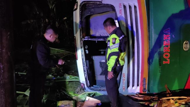 Dalam kondisi gelap, mobil pun terperosok ke luar dari jalan dan menghantam pohon pisang. Bus akhirnya tumbang ke sebelah kiri hingga kaca pecah.